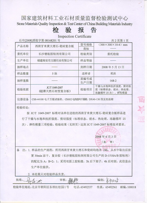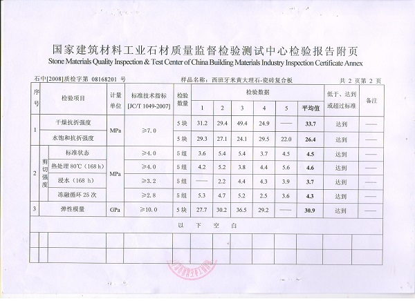 3、按照J(rèn)C/T1049-2007《超薄天然型石材復(fù)合板》標(biāo)準(zhǔn)進(jìn)行檢測(cè)。國(guó)家建筑材料石材質(zhì)量監(jiān)督檢驗(yàn)測(cè)試中心檢測(cè)結(jié)果于下: